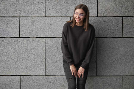 Woman wearing black sweatshirt or hoodie for mock up, logo designs or design prints with with free space on the city streets.