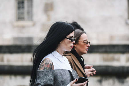 Milan, Italy - February 20, 2019: Street style outfits - models, bloggers and influencers before a fashion show during Milan Fashion Week - MFWFW19