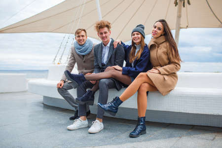 Young urban people wearing sunglasses, warm clothes and wool cap posing against a concrete wall in the street
