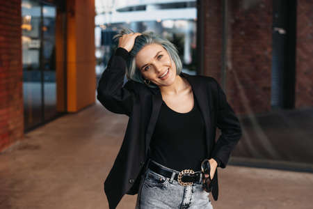 Beautiful portrait of blue haired businesswoman. Pretty young woman. Stylish person posing outside.
