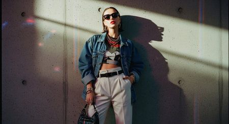 Urban Fashion Display Featuring Young Woman in Colorful Bomber Jacket and Distressed Denim