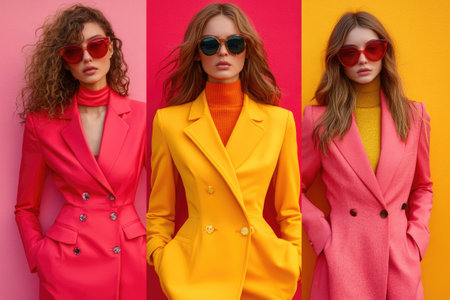 Three fashion models posing in pink, yellow and orange blazers and sunglasses, showcasing a vibrant and stylish look
