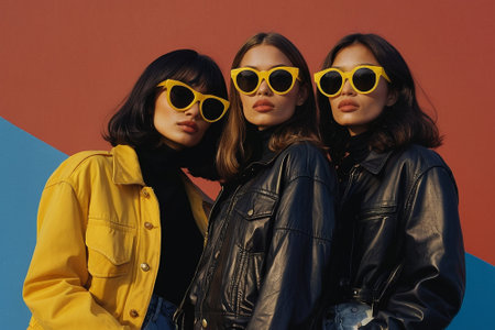 Three stylish young women in yellow sunglasses posing on red and blue background.