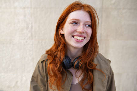 Happy teen redhead girl laughing standing on urban wall background.