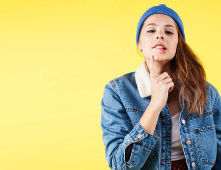 Cropped portrait of cute looking young beautiful girl in colorful cloth isolated over yellow background