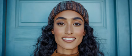 A woman with long curly hair smiles brightly while wearing a cozy knitted hat. She stands confidently in front of a vibrant blue door enjoying a clear day.
