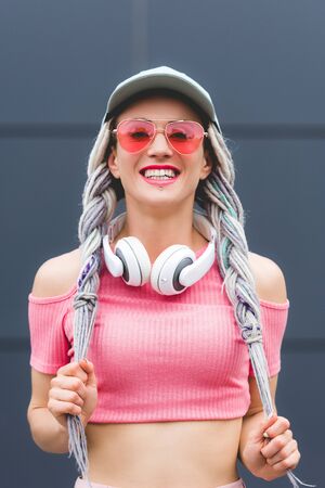 beautiful stylish girl with dreadlocks and headphones smiling and looking at camera