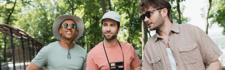 young tour guide in sunglasses talking to multiethnic tourists wearing sun hats in green park, banner