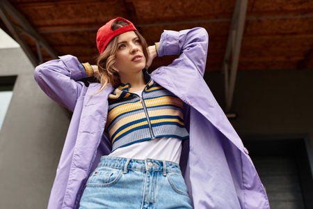 Beautiful woman embraces summer warmth, dressed in colorful casual wear, exuding confidence.