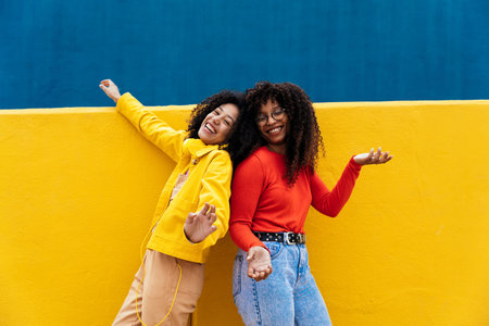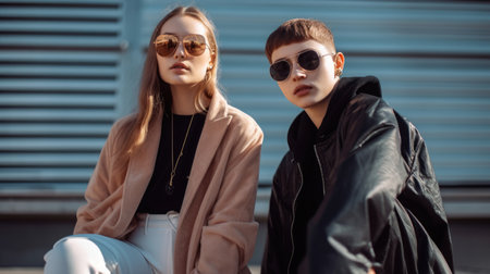 Two cool women wearing very trendy fashionable clothes. Generative AI AIG20.