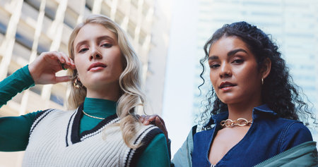 Women, students and portrait in city with fashion for travel in urban town for education or scholarship with trendy style. People, together and gen z girls with serious confidence in Amsterdam.