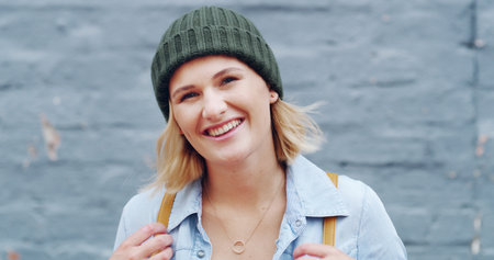 Happy, student and portrait of girl in city for travel, adventure and explore town on weekend. Relax, wall background and face of person with backpack for university, college or campus break outdoors