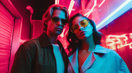 Fashion-forward man and woman standing confidently in a neon alleyway, wearing retro-inspired Y2K sunglasses and modern streetwear under vibrant pink and blue lighting.
