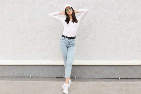 Full length portrait of attractive young lady with perfect body posing with raising hands, wearing trendy jeans, shirt, baseball cap and sunglasses, woman expressing confidence.