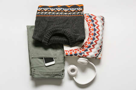 Male sweaters, pants, mobile phone and headphones on light background