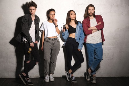 Picture of concentrated young hipsters friends standing over gray background.