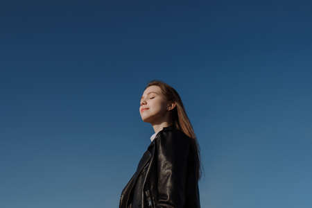 Smiling young woman in black jacket standing in front of blue sky enjoying bright sunlight. Mental health, relaxation, freedom concept. Girl in casual outfit with closed eyes. Golden hour sunlight