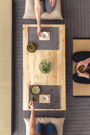 Top view on people eating japanese food on wooden table during meeting. Real photo