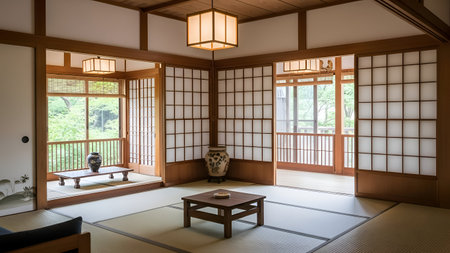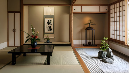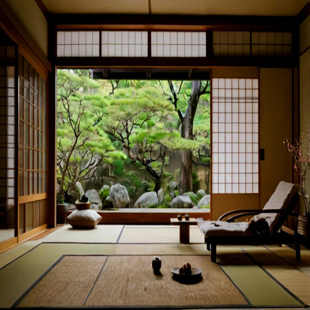 Traditional Japanese room overlooking serene zen garden with lush greenery and stone pathway.