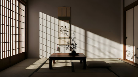 A minimalist living room with shoji screens, a beige sofa, and wooden furniture, creating a serene atmosphere.