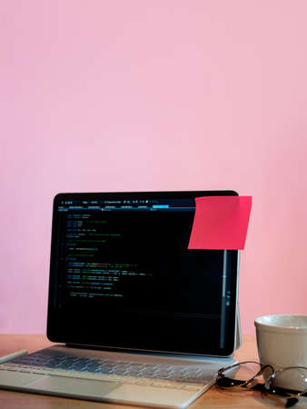 Software development. Software source code. Programming code. Writing code programming on laptop.