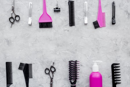 Combs, scissors and hairdressing tools on grey table background top view.