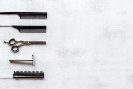Professional tools for a barber shop on a gray background. Top view. Space for text