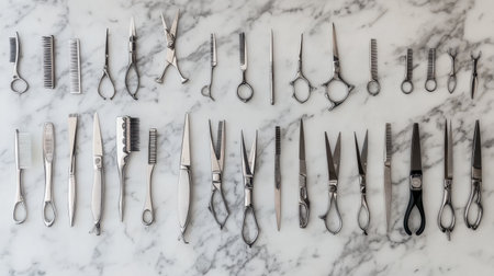 A meticulously arranged collection of various hair cutting tools and scissors displayed on a stylish marble surface, ideal for beauty professionals.