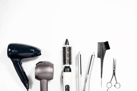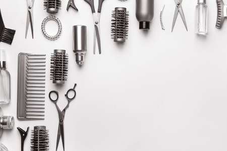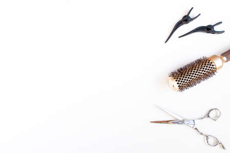 Beauty salon. Hairdresser equipment for cutting hair and styling with combs, scissors, brushes on white background top view copyspace