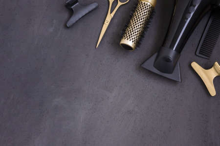 Hairdressing tools in black and gold on a gray concrete background. Hair salon accessories, hair dryer, combs, scissors and hair clips in the corner and with copy space. Template for business cards.