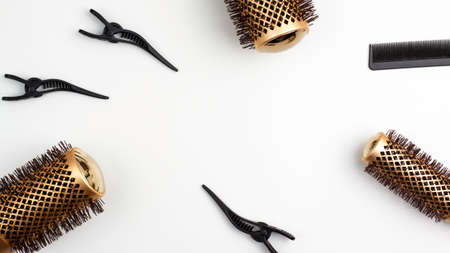 Top view flat lay of professional hair cutting shears, gold round hair brush for styling and section hair clips of the right site of the image. Hairdresser salon equipment concept, premium hairdressing set.