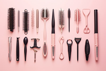 Professional tools for haircut on pink background, ai generated