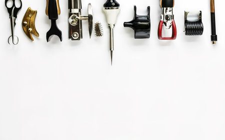 A collection of DIY and hobby tools such as brushes, scissors, and paints neatly arranged with plenty of space for creative input.
