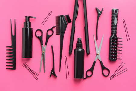 Set of hairdresser tools and accessories on color background