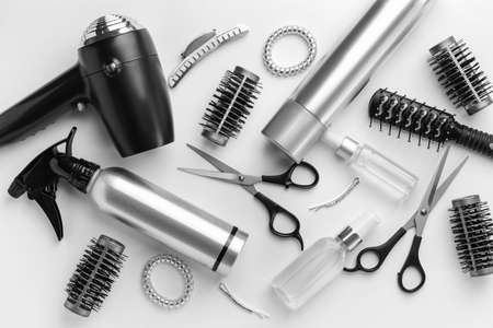 various hairdressing tools on a gray background. beauty salon concept.