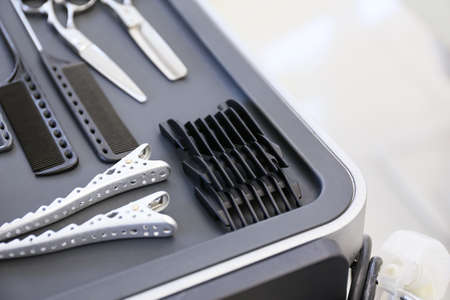 Professional barber tools in case for barbershop, work place
