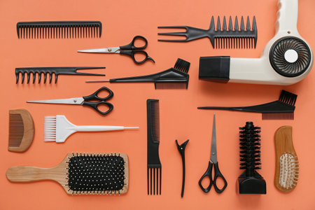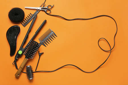 Set of hairdresser's tools on color background