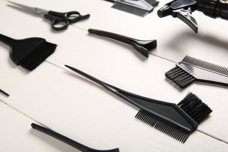 Set of hairdresser's tools on white wooden background
