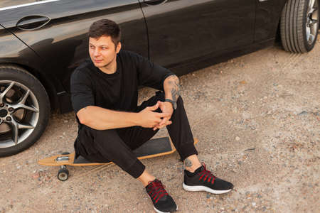 Portrait of beautiful blonde sexy fashion woman model in cap and in all black with bright makeup near red city car with open hood.