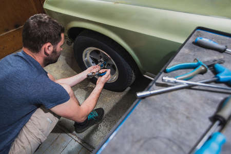 Young man removing wheels or tires from an old vintage car from the 60s or 70s in his home garage. Tools are seen around.