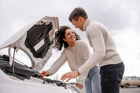 Beautiful young woman standing by automobile and smiling while man checking wheel. Handsome auto mechanic helping female driver to change car tire on the road.
