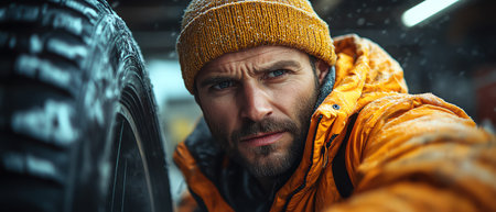 Mechanic in a garage, focused, tightening a wheel in an orange jacket and beanie