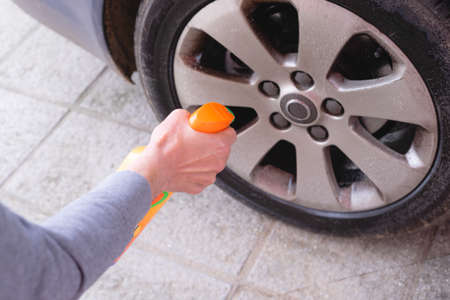 Man checking air pressure and filling air in the tires of car. Concept picture