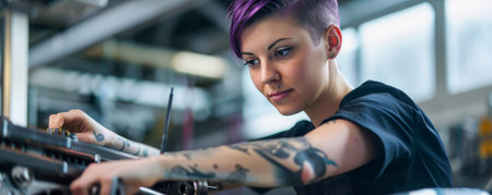 young tattooed woman working in tattoo studio on machine, blurred foreground