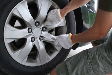 Car service, changing wheel. Man unscrewing car wheel with wrench.
