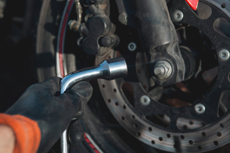 close up of hands of mechanic in uniform repairing motorcycle wheel