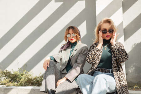 Two elegance fashion beautiful girls in stylish clothes sits on the street near a gray wall. Urban female style outfit