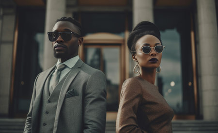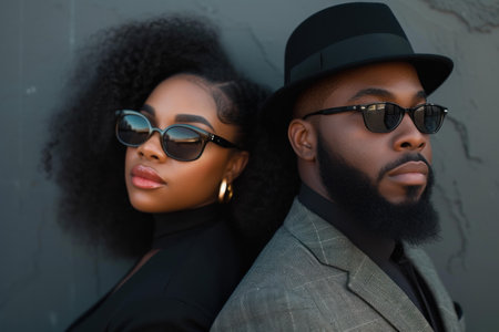 Stylish couple Funky young couple wearing sunglasses and smiling while standing against colorful background : Generative AI