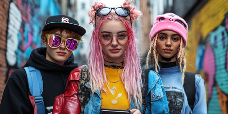 A 90s fashion photo shoot, with models in iconic 90s outfits, including denim, flannels, and bright prints, against a backdrop of 90s urban graffiti and street art, highlighting the era's fashion trends