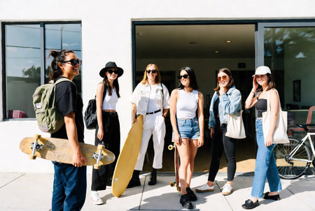 Group of young women friends with skateboards on the street. Outdoor lifestyle portrait